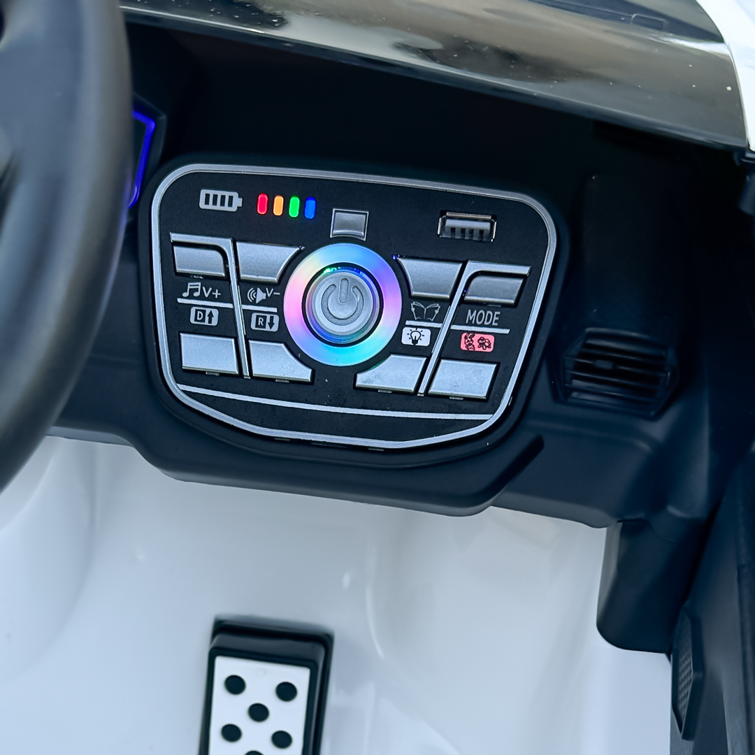 Cu funcția drift, micuțul tău va putea simți adrenalina virajelor, rotindu-se în cercuri perfecte, exact ca un pilot de curse. Panoul muzical cu multiple funcții, portul USB și conexiunea Bluetooth transformă fiecare călătorie într-o aventură sonoră personalizată. Scaunul tapițat cu piele ecologică nu doar că oferă confort sporit, ci și un plus de stil, aducând o notă de lux la fiecare plimbare.