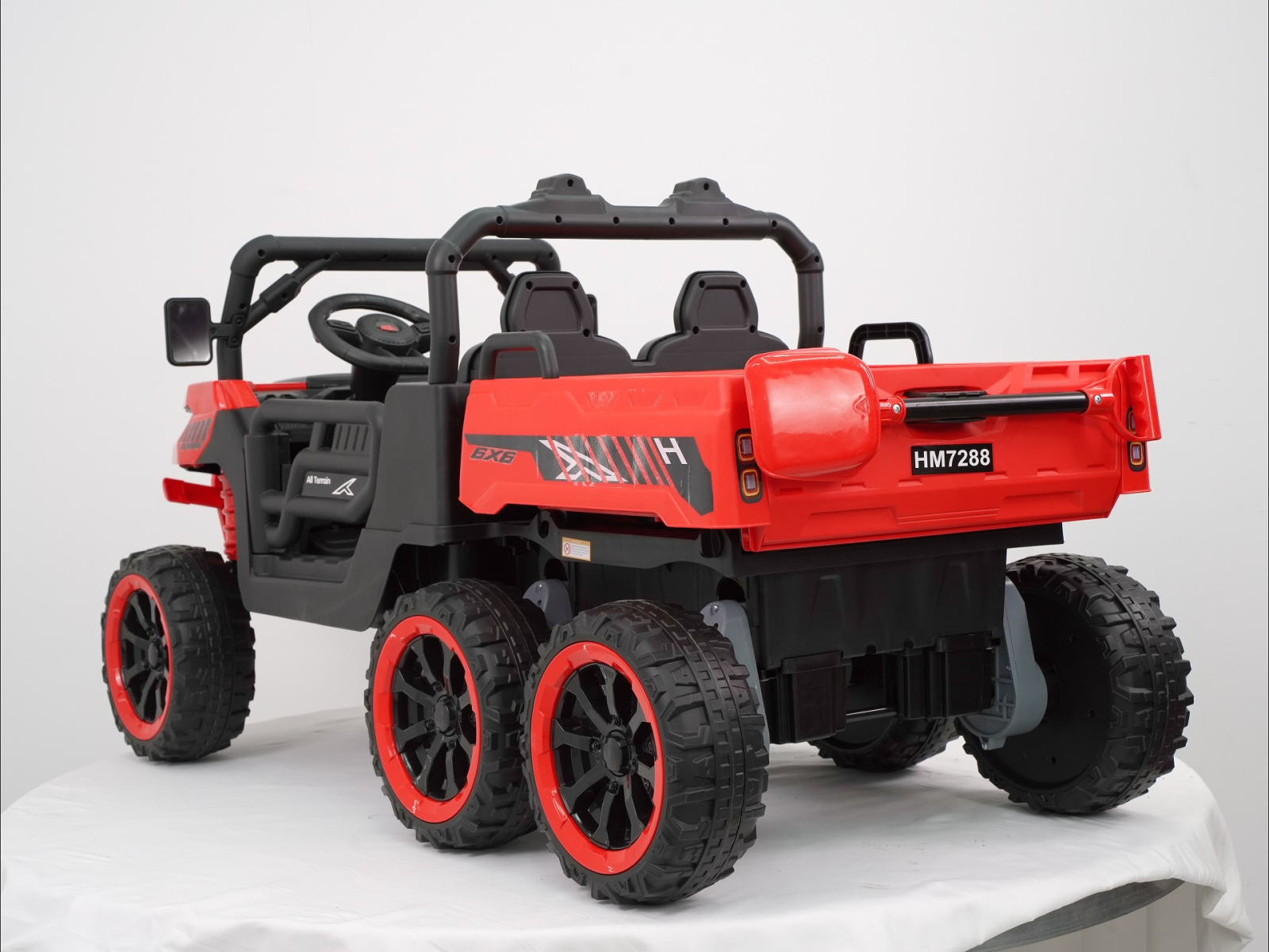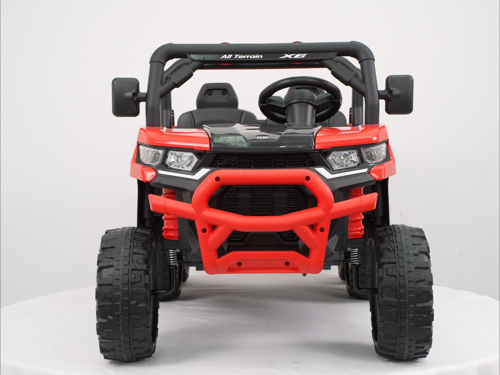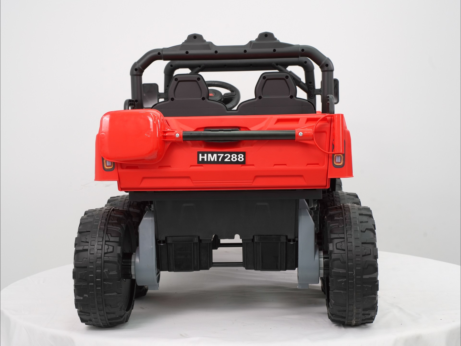 UTV-ul utilitar este destinat copiilor intre 3 si 7 ani. Acesta are bancheta dubla tapitata cu piele ecologica pentru 2 copii, 4 motoare cu o putere totala de 300W, baterie reincarcabila de 24V 7Ah, tractiune 4x4, cupa basculabila si alte dotari premium.