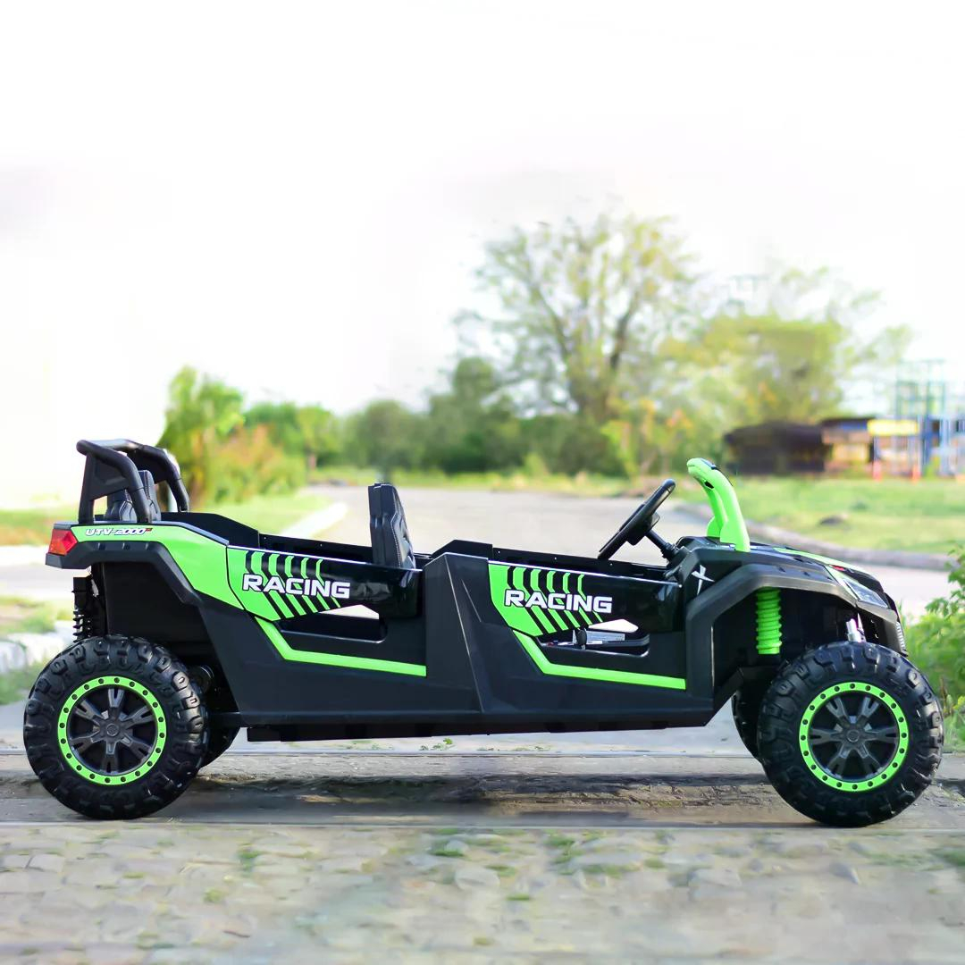 UTV-ul electric Kinderauto Racing 600W este destinat copiilor intre 4 si 8 ani, are echipare premium ce consta in roti moi din cauciuc EVA, 4 locuri, scaun tapitat cu piele ecologica si music player cu porturi pentru diferite conexiuni. Acesta are 4 motore electrice de 150W putere la o tensiune 24V, produs recomandat pana la 4 copii.