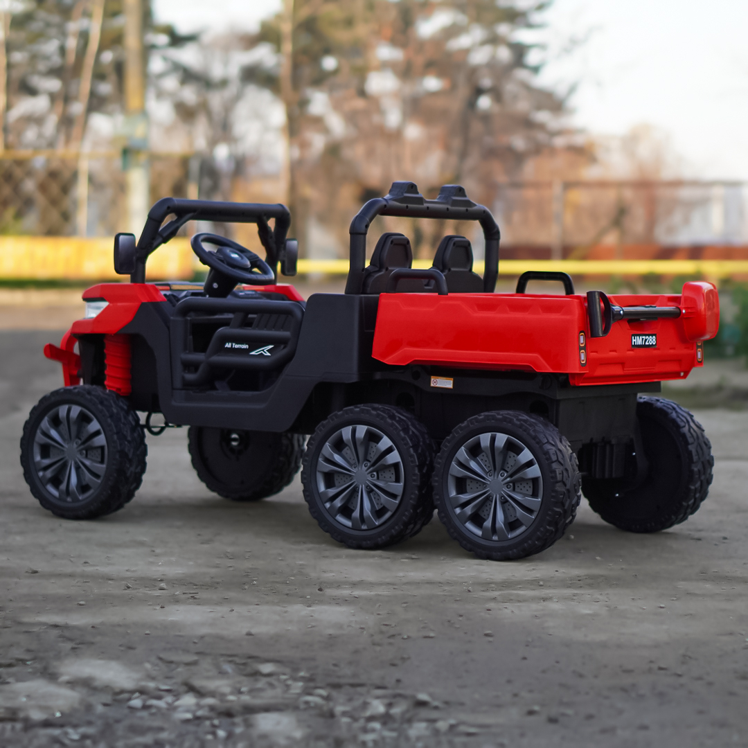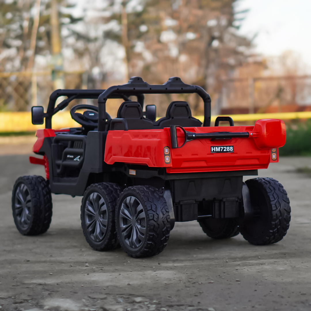 UTV-ul utilitar este destinat copiilor intre 3 si 7 ani. Acesta are bancheta dubla tapitata cu piele ecologica pentru 2 copii, 4 motoare cu o putere totala de 300W, baterie reincarcabila de 24V 7Ah, tractiune 4x4, cupa basculabila si alte dotari premium.